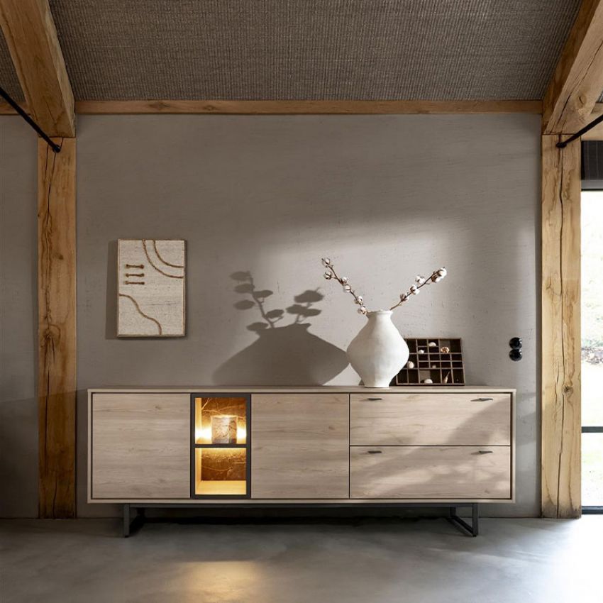 De meeste meubels uit de HELSINKI-collectie zijn uitgerust met open vakken met geïntegreerde LED-verlichting en een achterwand in marmerlook, ideaal om je mooiste decoratiestukken te etaleren. De kastdeuren zijn greeploos en hebben een handig push-to-open systeem, terwijl de laden smalle, metalen handgrepen hebben en zachtjes sluiten dankzij het softclose mechanisme.