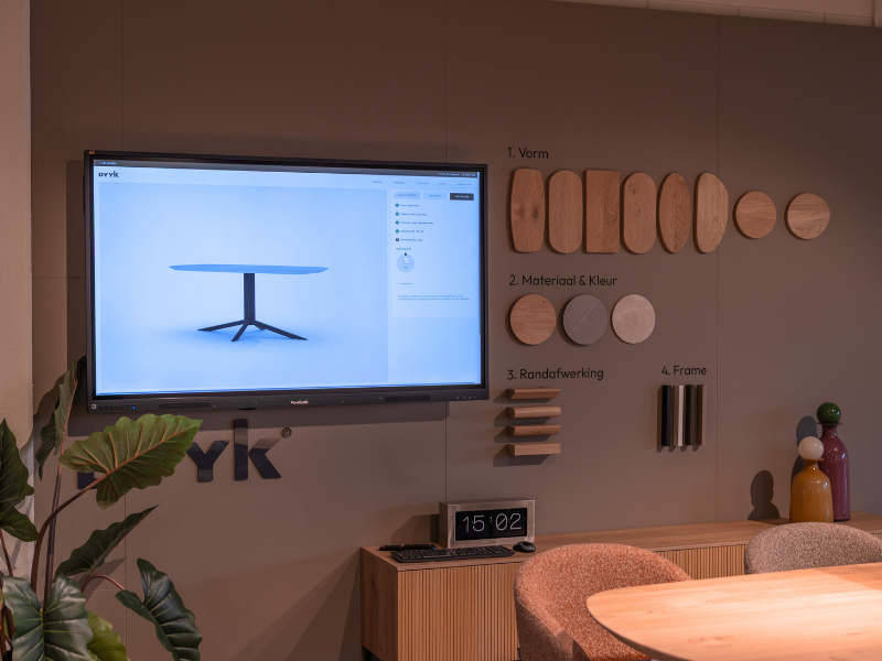 De tafels zijn zorgvuldig ontworpen met oog voor detail en hoogwaardige materialen, en passen zowel in moderne als tijdloze interieurs. Bij ons in de winkel ervaar je zelf hoe veelzijdig Dyyk is: op een groot touchscreen stel je jouw ideale tafel samen, van vorm en afmetingen tot houtsoort, onderstel en afwerking.