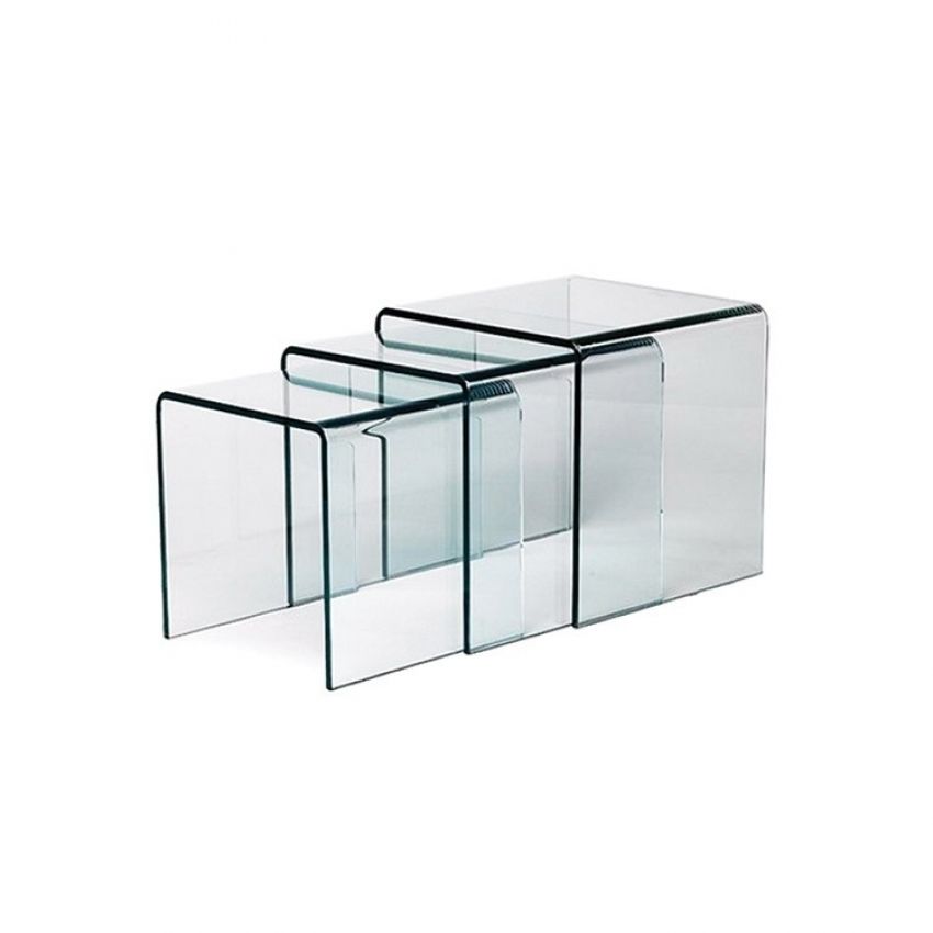 Luxe 3-delige set van bijzettafels, uitgevoerd in 12 mm dik gebogen glas met een heldere kleur.