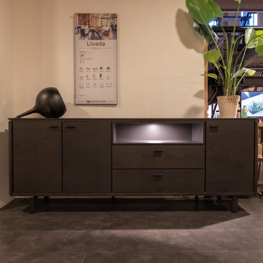 Dressoir Livada is een eigentijds ontwerp uit de collectie van Henders & Hazel. Dit opbergmeubel is minimalistisch vormgegeven en past goed in een Scandinavische woonstijl. Het dressoir is voorzien van drie deuren, twee laden en een open vak. Dit open vak is voorzien van LED verlichting om uw accessoires in de spot te zetten.