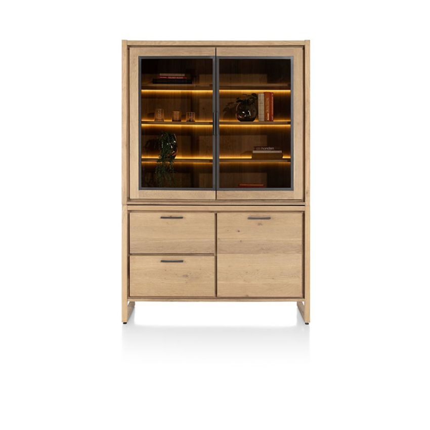 De kast beschikt over twee lades, één dichte deur en twee glasdeuren, waardoor je zowel kunt opbergen als presenteren. De geïntegreerde ledverlichting laat je mooiste items extra opvallen. Metalen grepen, een soft-closing systeem en een afwerking met platinumlak zorgen voor een matte, luxe uitstraling én duurzame bescherming.