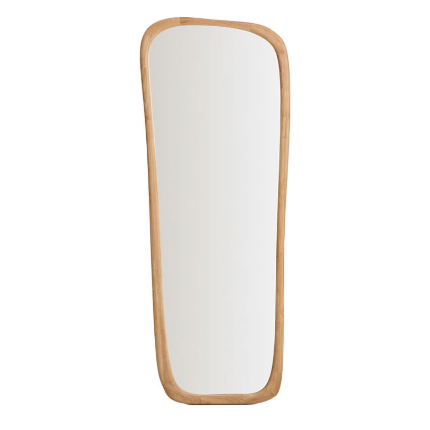 De Alura spiegel van Kave Home is organisch gevormd en gemaakt van teakhout, wat zorgt voor een warme en natuurlijke uitstraling. Het vloeiende, elegante ontwerp geeft elke ruimte dynamiek en karakter.