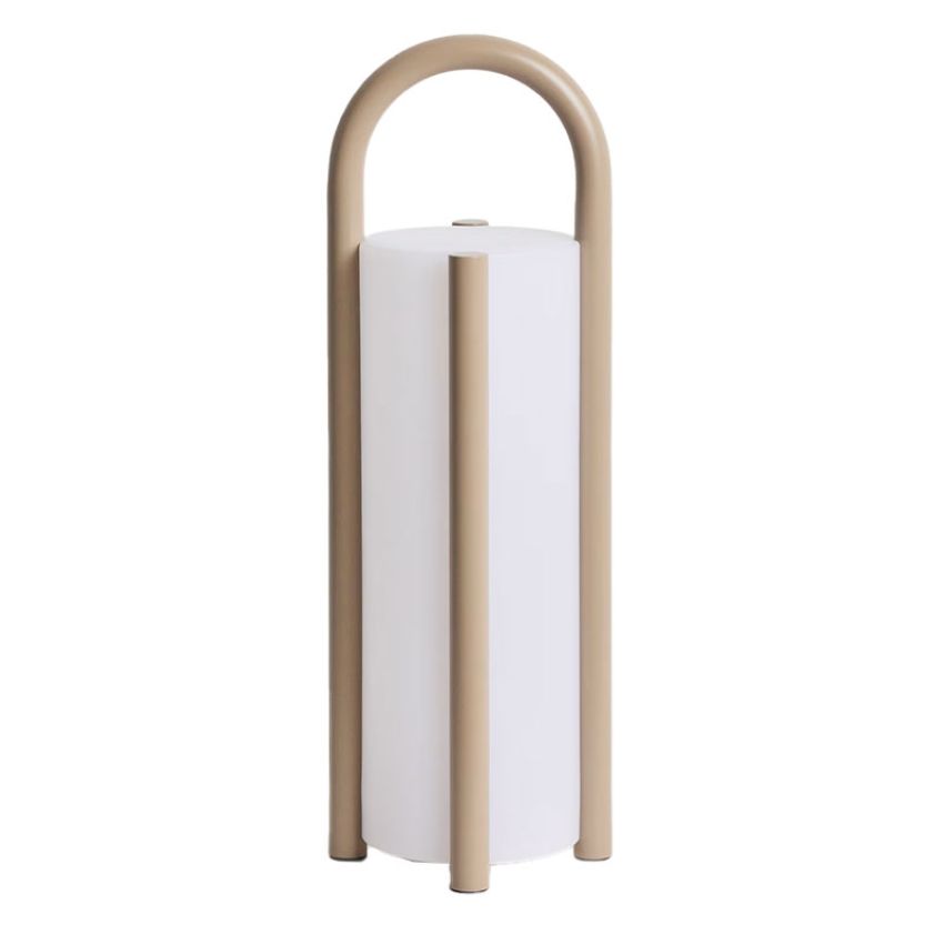 De Leros draagbare buitenlamp van Kave Home combineert een stalen structuur met een polyethyleen diffuser, ontworpen voor een functionele en sfeervolle verlichting in buitenruimtes.