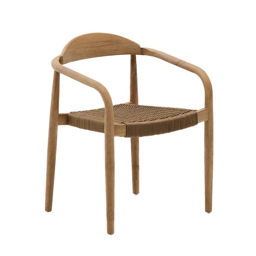 De Nina eetstoel van Kave Home combineert ambacht en natuurlijke materialen in een tijdloos ontwerp. Het frame is vervaardigd uit massief acaciahout met een warme, naturelle afwerking, waarbij elke stoel zijn eigen unieke tekening en kleurnuances heeft.