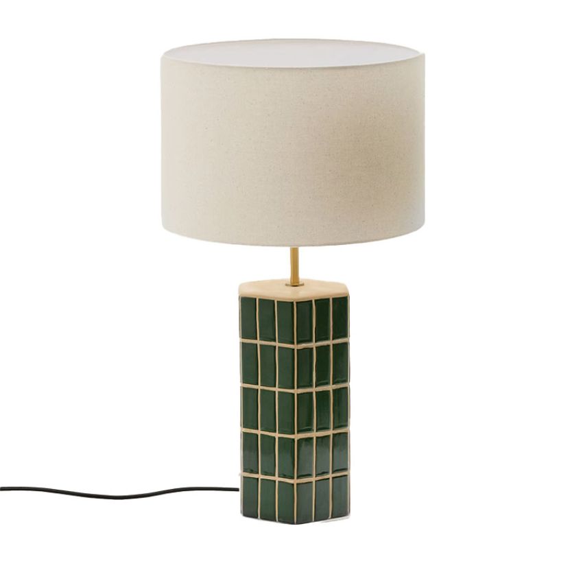 De tafellamp Rue van Kave Home combineert traditioneel vakmanschap met een moderne twist, waardoor elke ruimte een frisse en verfijnde uitstraling krijgt. De keramische voet is zorgvuldig beschilderd met een patroon dat groene tegels nabootst, waarbij het glazuurproces zorgt voor subtiele variaties in tinten en texturen. Hierdoor is elke lamp uniek en krijgt hij een exclusief karakter.
