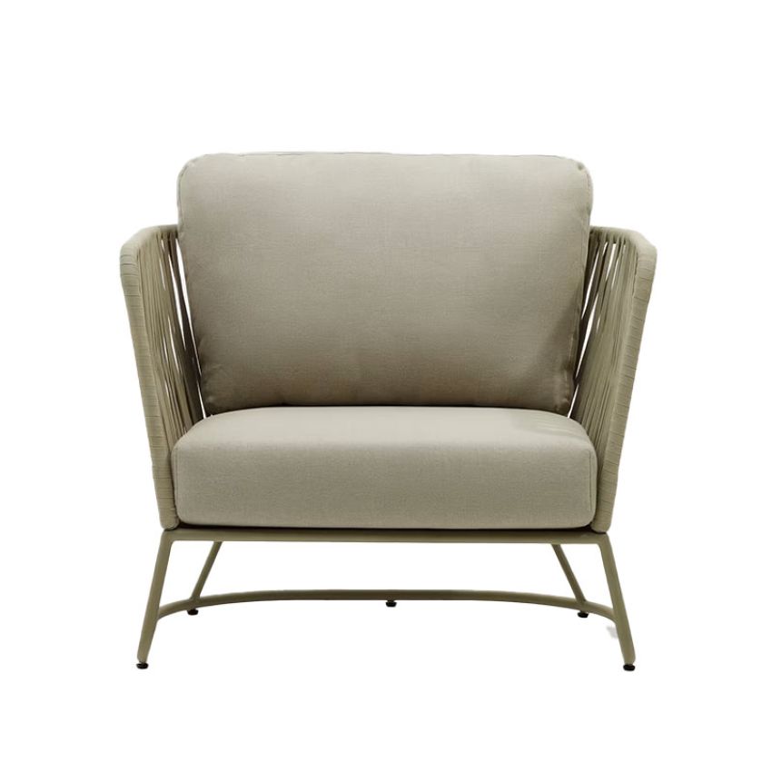 De Saconca fauteuil van Kave Home is een lichte en luchtige outdoorstoel die comfort en design samenbrengt. Het ontwerp combineert een slanke stalen structuur met een zitting in gevlochten touw, wat zorgt voor een modern contrast met een natuurlijke uitstraling.