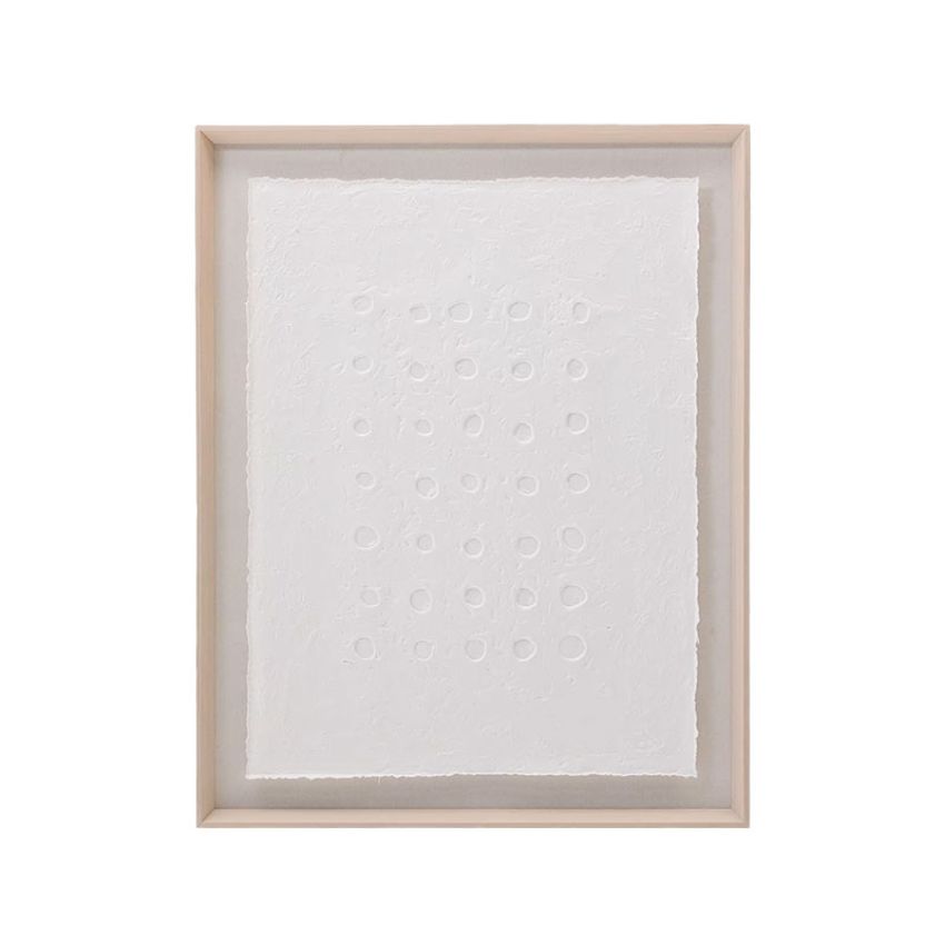 Door een speciale druktechniek ontstaat een gecentreerd patroon van stippen en cirkels, wat het schilderij extra textuur en diepte geeft. Elk exemplaar is uniek en weerspiegelt de zorg en toewijding waarmee het is vervaardigd. De strakke en minimalistische afwerking maakt Olvin tot een subtiele blikvanger aan de muur.
