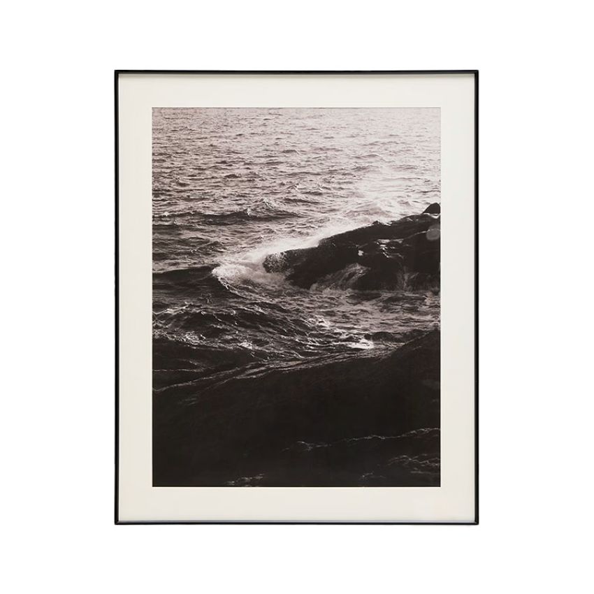 Het Zavira schilderij van Kave Home toont de kracht en sereniteit van de zee bij Cap de Creus, vastgelegd in een originele zwart witfoto van Sara Lomas, gefotografeerd met een 35 mm analoge camera. De beweging van de golven tegen de rotsen brengt diepte en rust in de ruimte, terwijl het tijdloze contrast zorgt voor een elegante uitstraling.