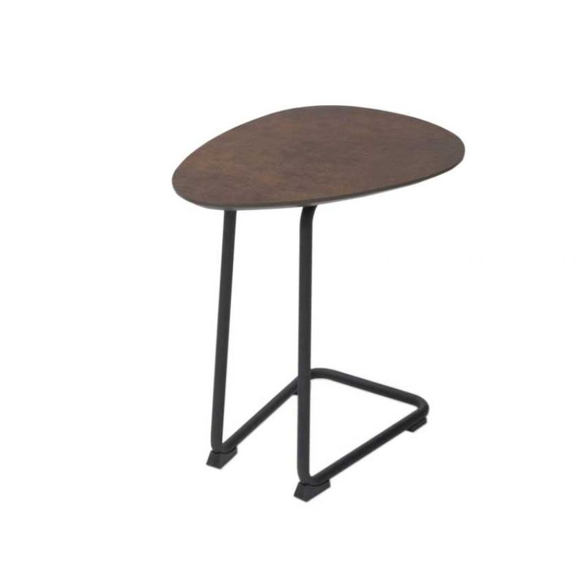 Uit voorraad leverbaar met een tafelblad in Plastica Patina Bronze en een zwart onderstel.