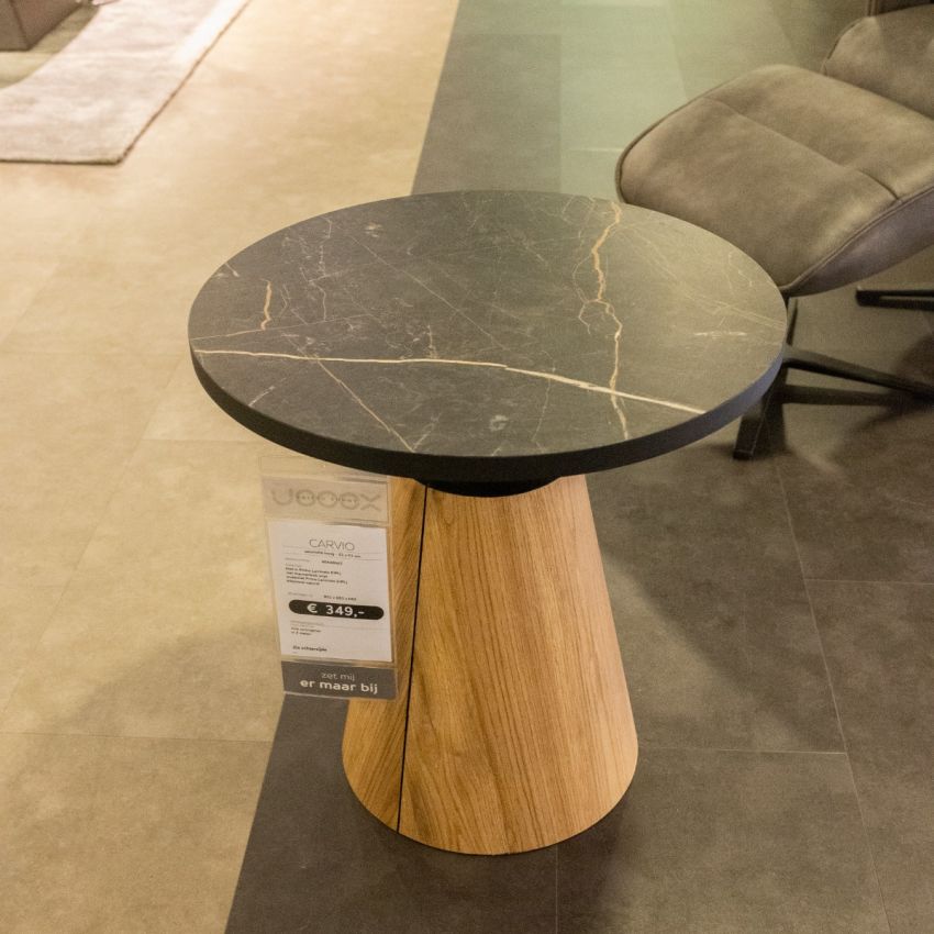 Carvio salontafel van Xooon is gemaakt van HPL met een marmerlook blad en eikenlook poot.