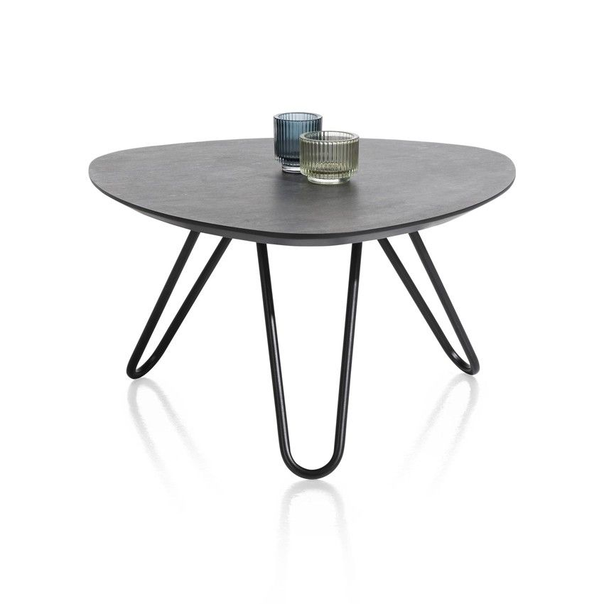 Stijl jouw zithoek af met deze prachtige, lage salontafel Masura. Het HPL blad heeft een stijlvolle organische vorm en is verkrijgbaar in 4 kleuren (keramiek look antraciet of roest, witte marmerlook of naturel eiken). Salontafel Masura staat op een strak zwart metalen onderstel.