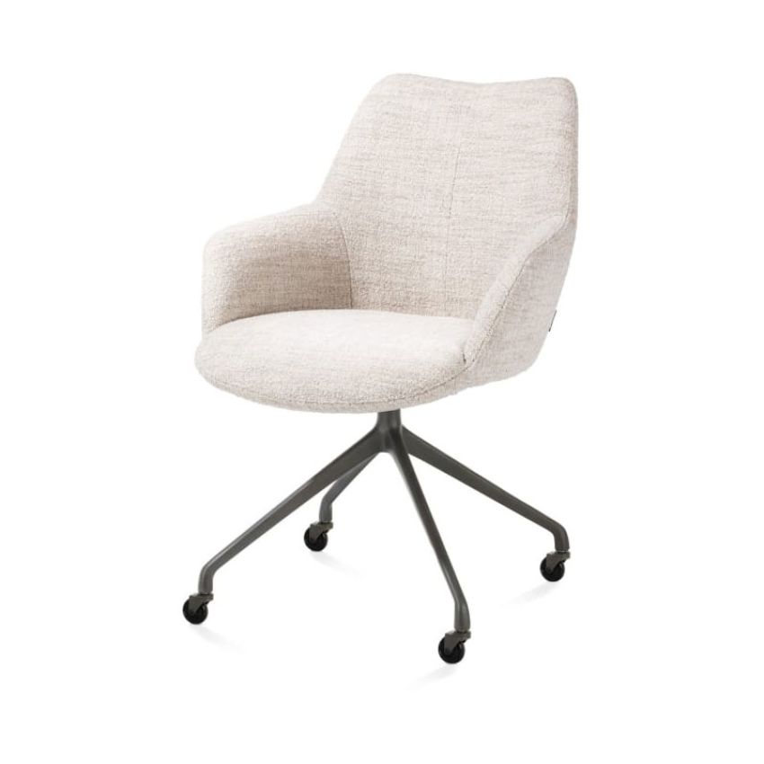 Armstoel MATS is een moderne en comfortabele toevoeging aan de eethoek. De stoel is uitgevoerd in de stijlvolle stof Luton Crème. Dankzij de wielen is MATS praktisch in gebruik, terwijl de elegante, ronde vormgeving zorgt voor een verfijnde uitstraling. Het aluminium frame in de kleur rough off black onderstreept het moderne karakter. De comfortabele zitting en prettige armleuningen bieden optimaal zitcomfort en maken het eenvoudig de stoel onder de tafel te schuiven. MATS is verkrijgbaar in diverse uitvoeringen wat betreft kleur, bekleding en onderstel.