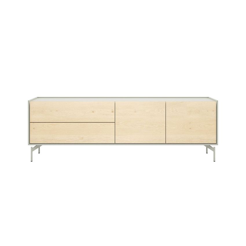 De kast is vervaardigd uit gelakt MDF met fronten in eikenfineer. De geïntegreerde grepen in het houten front zorgen voor een strak en rustig geheel. Doordat je het lowboard aan de wand kunt bevestigen, ontstaat een zwevend effect dat bijdraagt aan een ruimtelijke uitstraling in je woonkamer.