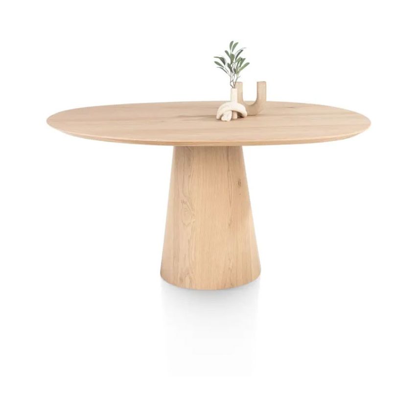 De Xooon Trenton eetkamertafel kenmerkt zich door een elegant organisch vormgegeven blad in de kleur naturel. De tafel is uitgevoerd in eikenfineer en rust op een centrale, conische poot die aan de binnenzijde is verzwaard voor optimale stabiliteit. Met een royale afmeting van 150 × 120 cm biedt Trenton comfortabel plaats aan meerdere gasten. Naast naturel is het blad ook verkrijgbaar in de kleur clay. De Trenton-serie wordt verder aangevuld met bijpassende salontafels en kasten voor een harmonieus interieur.