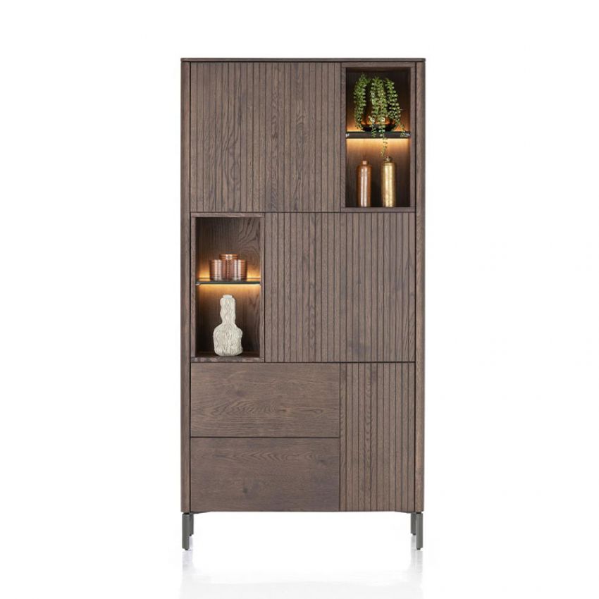 Met 3 deuren, 2 laden en 4 open niches met geïntegreerde ledverlichting biedt de Xooon Trenton volop opbergruimte én een sfeervol accent. De kast rust op een slank metalen onderstel in grafietkleur en is uitgerust met een handig push-to-open systeem voor een strakke, greeploze afwerking.
